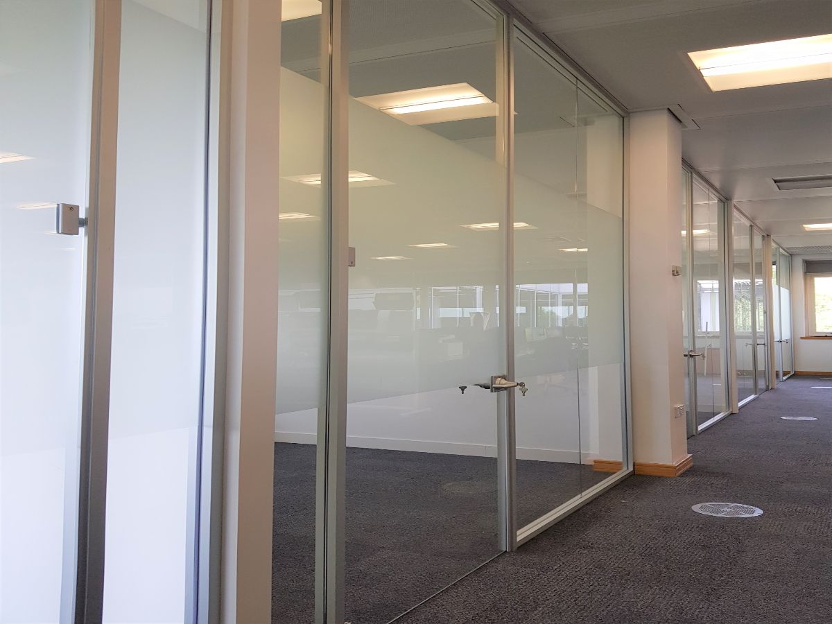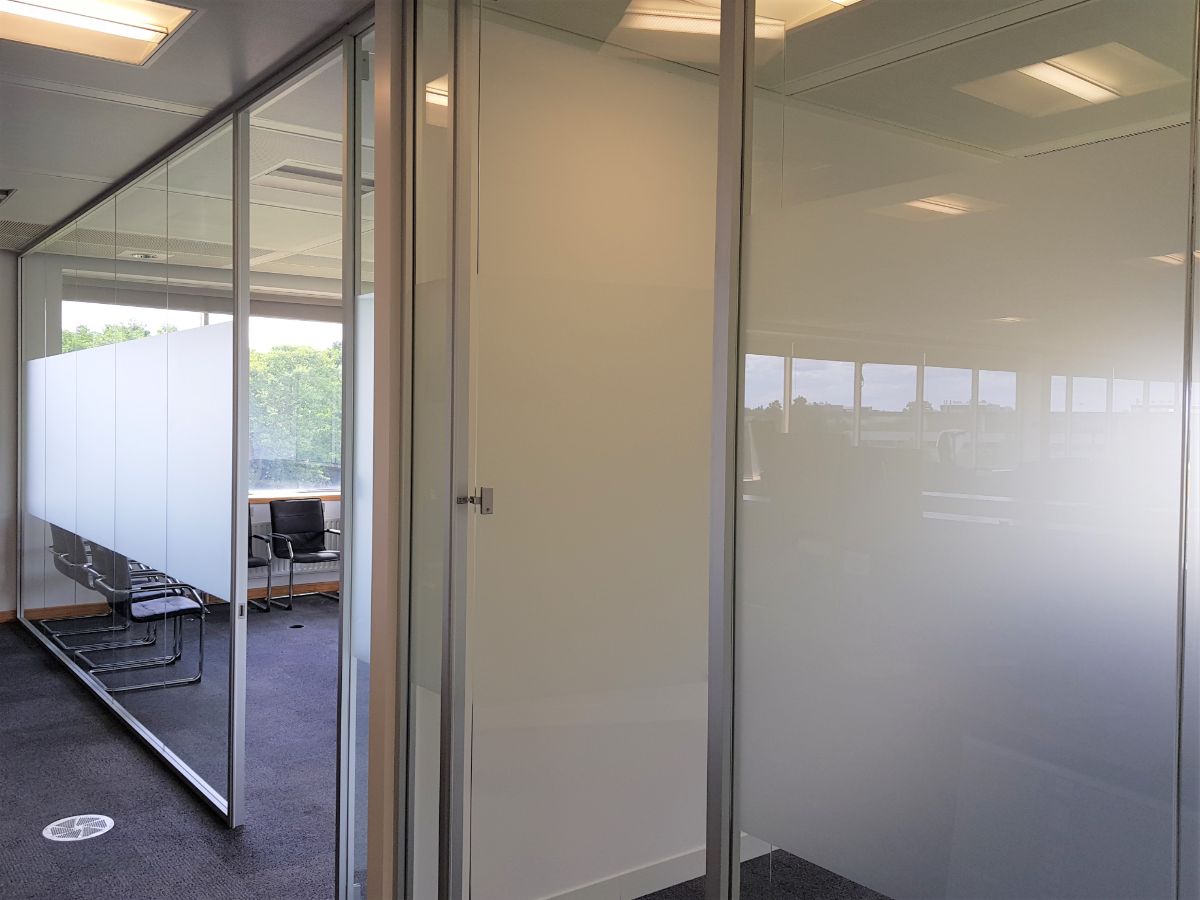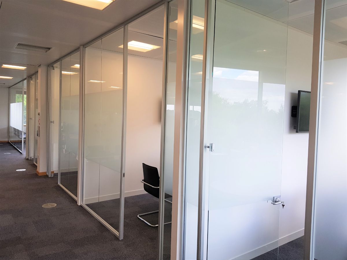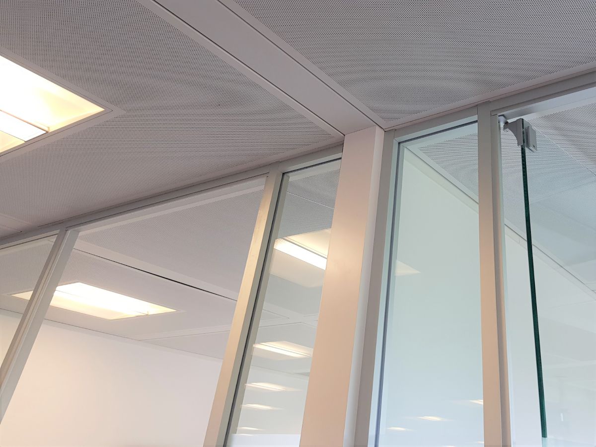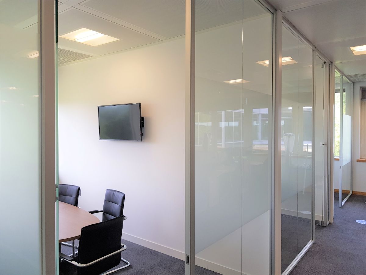 In this project, we combined plasterboard partitions between the meeting rooms to provide enhanced sound absorption. Our experienced fitters profiled the plasterboard carefully at the external windows to prevent any damage should the partition need to be removed at a later date. Solid walls also provide a neat cable management solution concealing wiring for audio-visual, air-conditioning & power.